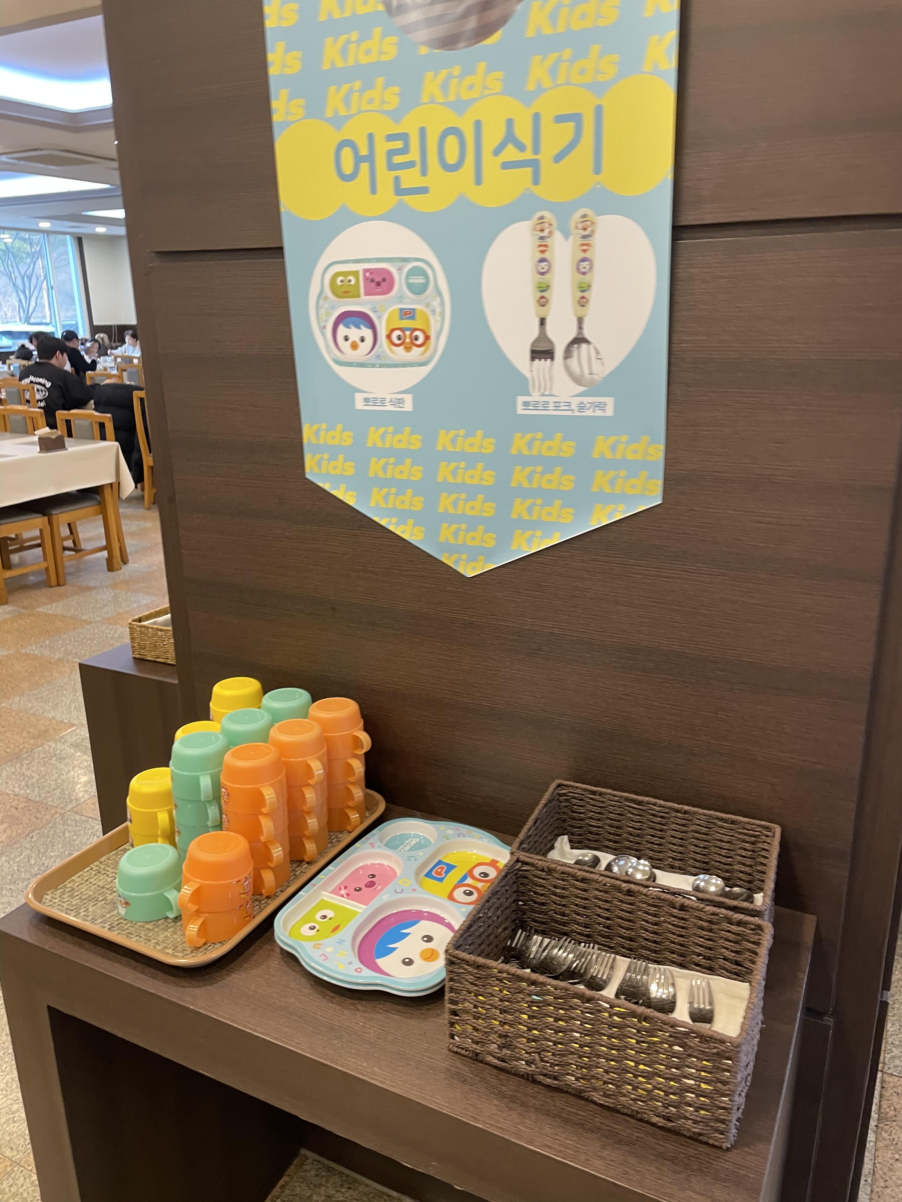 테이블 간 간격이 넓어 쾌적하며, 유아용 의자와 뽀로로 식기 세트 등 아이들을 위한 배려도 돋보입니다.